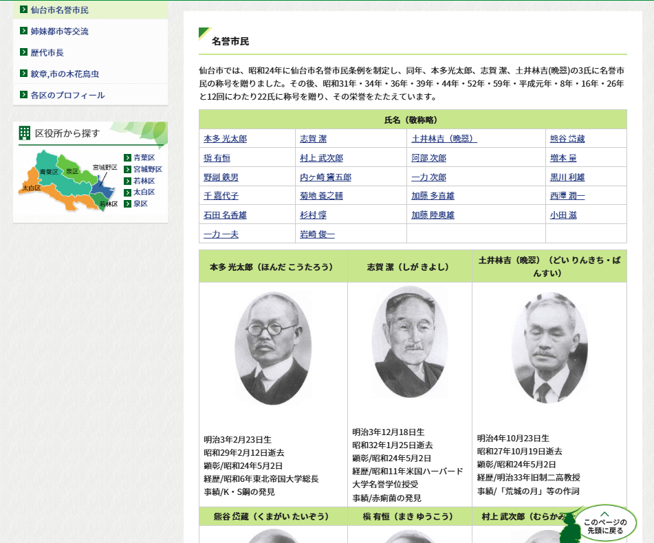 その象徴的な例が、本市名誉市民の扱い方です。そもそも名誉市民顕彰の目的は、単なる個人の栄誉にとどまらず、様々な分野での貢献を広く市民に知らせ、その功績を称えることで、市民に長く記憶されるようにすることが目的です。ところが、本市HPには名誉市民の功績が、ほんの一言ずつしか載っていません。